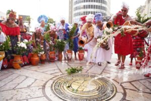 Logo nas primeiras horas do dia, às 6h, o Núcleo da Cultura Afro, no Pátio do Terço, no bairro de São José, se tornou espaço de preparação espiritual. Ialorixás e babalorixás entoaram oríkì e cânticos litúrgicos durante a preparação do banho de ervas, em uma cerimônia coordenada por Mãe Fátima d’Oxum e Pai Marquinhos d’Ossaiyn. O momento de sacralização marcou o início de um dia dedicado à fé, à memória e ao pertencimento.
